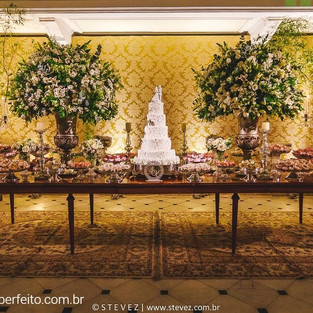 Após o “sim”, os noivos receberam seus convidados na Mansão Botafogo — um espaço imponente, que combinou perfeitamente com o estilo da festa. A recepção teve décor impecável com toques dourados, folhagens e flores brancas, compondo um cenário sofisticado e acolhedor.